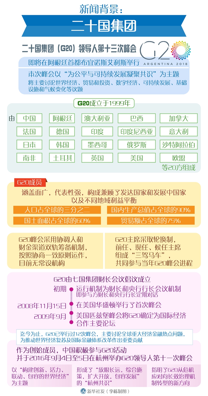 二十國集團(G20)領導人第十三次峰會即將在阿根廷首都布宜諾斯艾利斯舉行。本次峰會以“為公平與可持續發展凝聚共識”為主題,將主要討論世界經濟、貿易和投資、數字經濟、可持續發展、基礎設施和氣候變化等議題。