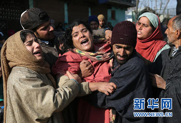 12月15日,在印控克什米爾首府斯利那加以南的一座村莊,人們參加遇難者的葬禮。 新華社發(賈韋德·達爾 攝)