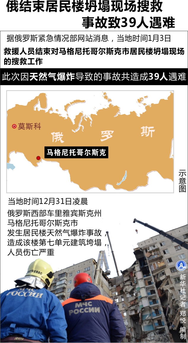 新華社莫斯科1月3日電(記者欒海)據(jù)俄羅斯緊急情況部網(wǎng)站消息,救援人員3日結(jié)束對(duì)馬格尼托哥爾斯克市居民樓坍塌現(xiàn)場(chǎng)的搜救工作,此次因天然氣爆炸導(dǎo)致的事故共造成39人遇難。