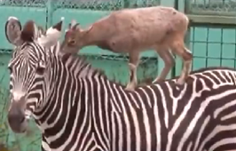 山羊斑馬玩“疊羅漢”