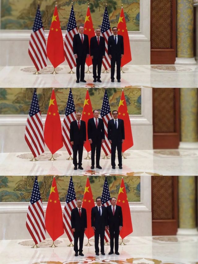 會談開始前,劉鶴副總理在芳華苑大廳迎接前來談判的美方牽頭人,貿易代表萊特希澤和財政部長姆努欽。