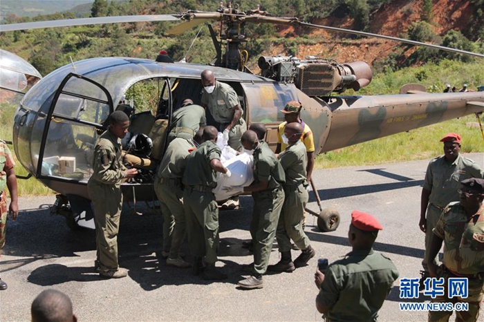 3月21日,在津巴布韋馬尼卡蘭省奇馬尼馬尼,一架軍方直升機轉運遇難者遺體。新華社發(肖恩·朱薩 攝)