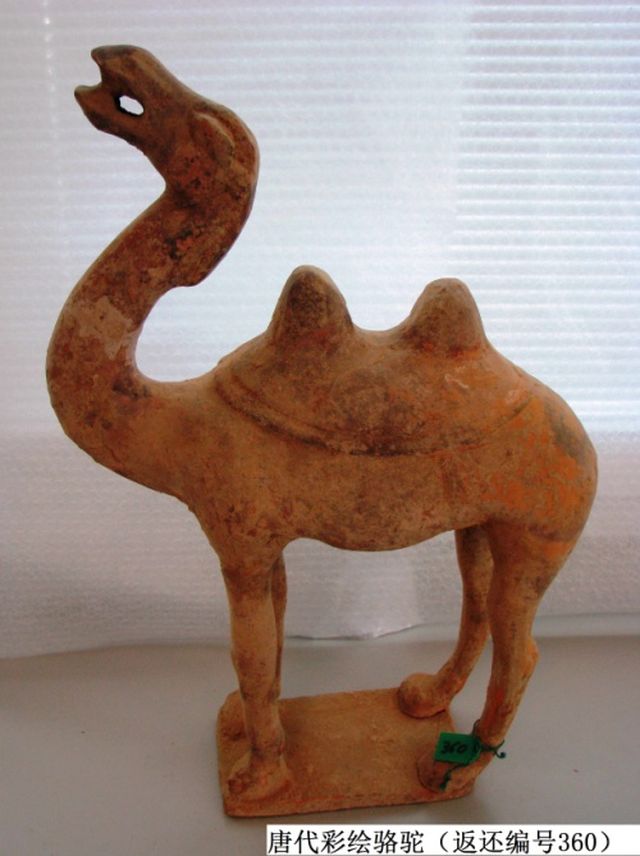 這是唐代彩繪駱駝(返還編號(hào)360),駱駝作昂首嘶鳴狀。