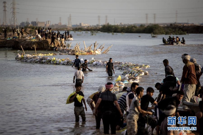 4月11日,在伊朗阿瓦士附近,人們在搭建防洪堤。近期,伊朗境內持續洪澇災害。新華社發(艾哈邁德·哈拉比薩斯 攝)