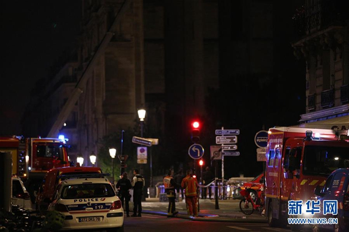 4月15日,在法國巴黎,警車和消防車停靠在巴黎圣母院旁。新華社記者 高靜 攝