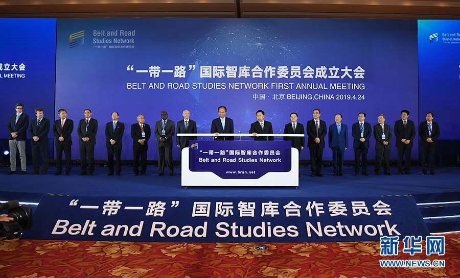 4月24日,由新華社研究院聯合15家中外智庫共同發起的“一帶一路”國際智庫合作委員會在北京宣告成立。這是“一帶一路”國際智庫合作委員會理事長、新華社社長、新華社研究院院長蔡名照等共同見證“一帶一路”國際智庫合作委員會官網(www.brsn.net)上線。 新華社記者 金良快 攝