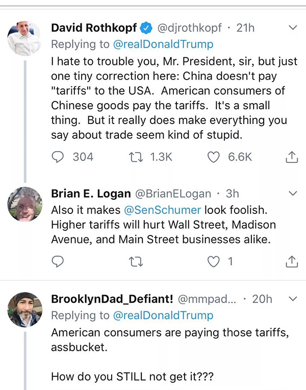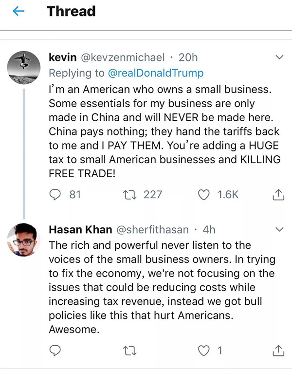“我是一個擁有一家小企業的美國人。對我的生意來說,有些關鍵商品必須由中國制造而且永遠也不可能在美國生產出來。中國什么也沒付,是我付出了那些關稅!你給美國的企業們加上了巨大的稅賦!你正在扼殺自由貿易!”