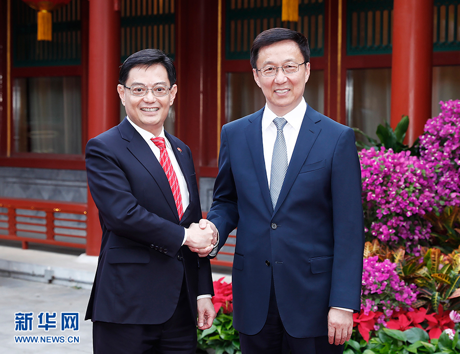 韓正表示,中方高度重視中新關系,明年兩國將迎來建交30周年,雙方要以此為契機,推動中新關系在新時期實現更大發展。中方愿同新方一道,落實好兩國領導人共識,繼續用好合作機制平臺,推動各領域務實合作取得更大發展。雙方要保持密切溝通,高質量共建“一帶一路”,建設好“陸海新通道”,深化第三方市場合作,開展粵港澳大灣區建設合作,發揮示范和帶動效應,推動地區和沿線國家共同發展。