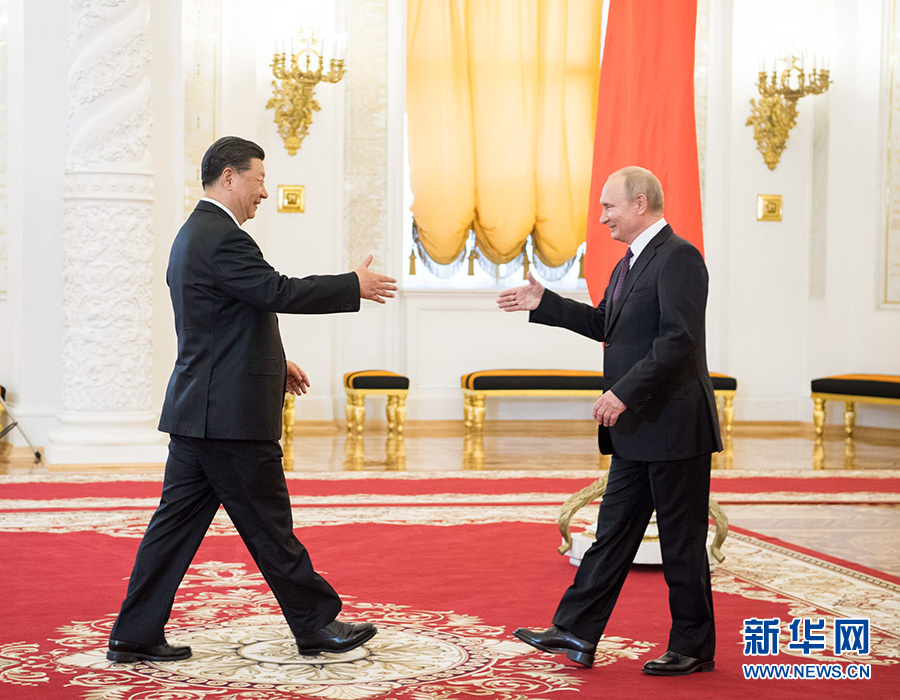 6月5日,國家主席習近平在莫斯科克里姆林宮同俄羅斯總統普京會談。這是會談前,兩國元首緊緊握手,合影留念。 新華社記者 丁海濤 攝
