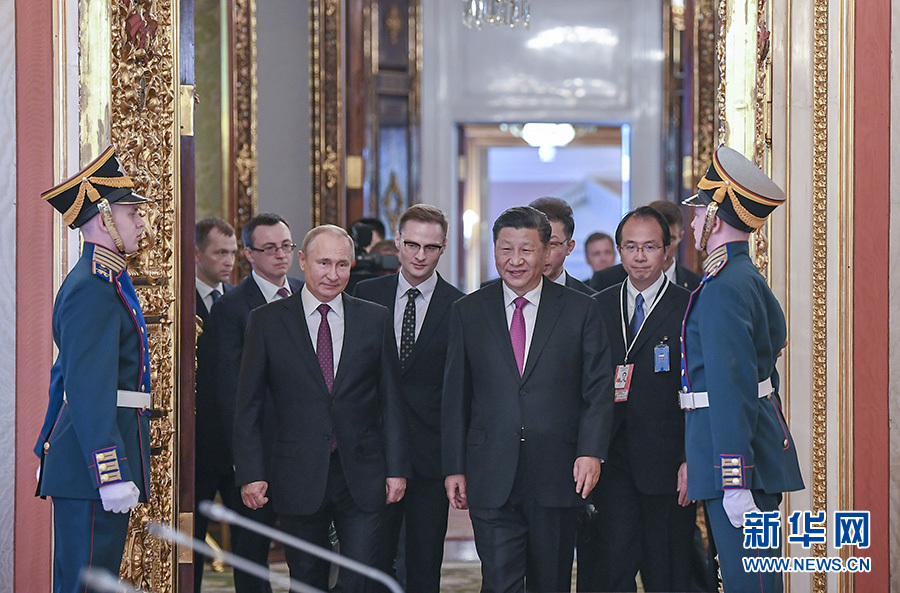6月5日,國家主席習近平在莫斯科克里姆林宮同俄羅斯總統普京會談。這是兩國元首步入會場。 新華社記者 謝環馳 攝