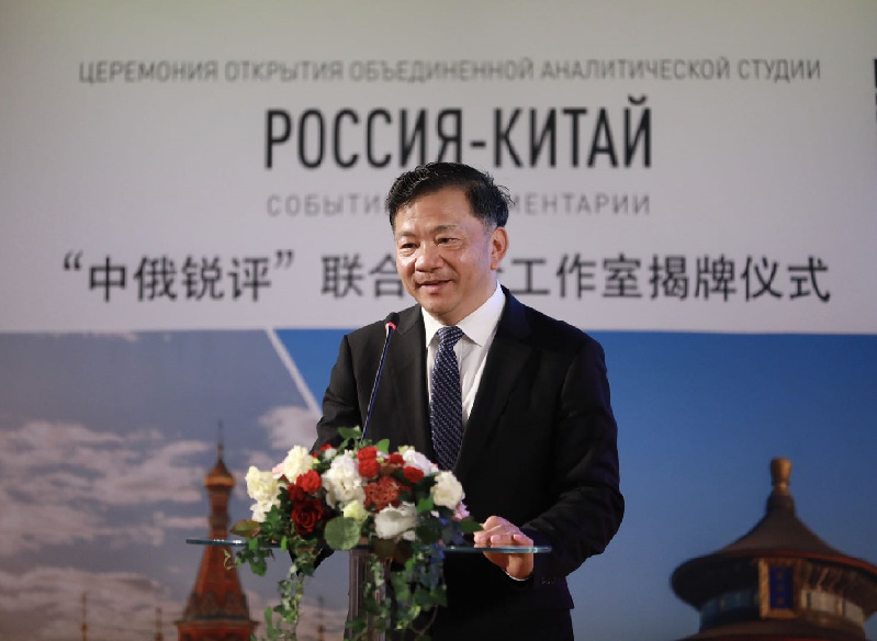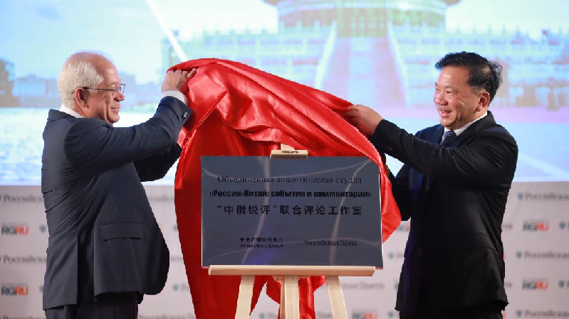 6月5日,由中央廣播電視總臺(tái)與俄羅斯政府機(jī)關(guān)報(bào)《俄羅斯報(bào)》共同打造的“中俄銳評(píng)”聯(lián)合評(píng)論工作室揭牌儀式在莫斯科舉行。中宣部副部長、中央廣播電視總臺(tái)臺(tái)長慎海雄,俄羅斯報(bào)社長涅戈伊察出席儀式,并共同為“中俄銳評(píng)”聯(lián)合評(píng)論工作室揭牌。