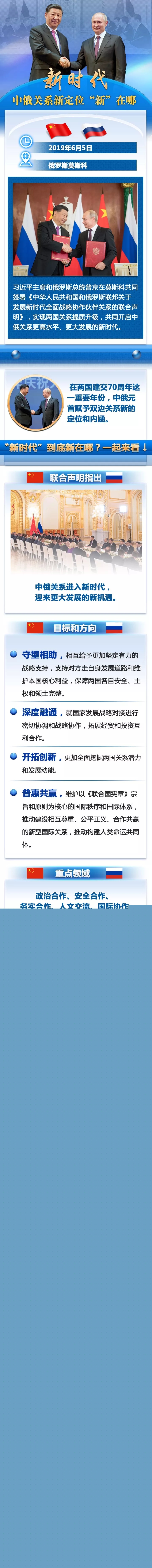 6月5日,習近平主席和俄羅斯總統普京在莫斯科共同簽署《中華人民共和國和俄羅斯聯邦關于發展新時代全面戰略協作伙伴關系的聯合聲明》,實現兩國關系提質升級,共同開啟中俄關系更高水平、更大發展的新時代。