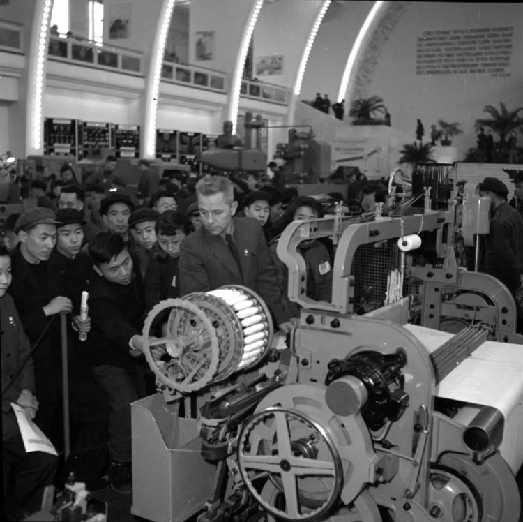 ↑上海,觀眾在蘇聯經濟及文化建設成就展覽會上參觀蘇聯制造的自動織布機.(1955年3月15日,楊溥濤)