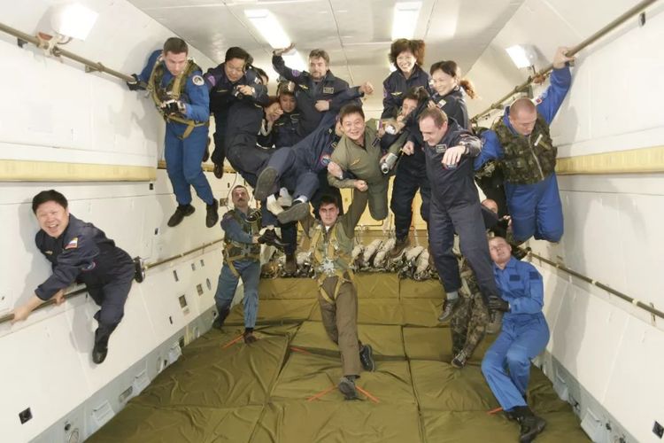 ↑在俄羅斯首都莫斯科的加加林阿特拉斯宇航中心,10名中國游客在俄羅斯宇航員的保護下體驗太空失重訓練。(2004年12月17日,陳建力)