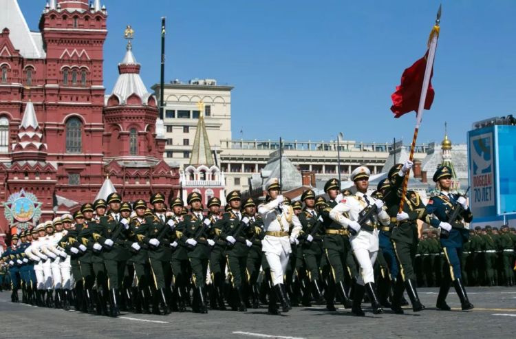 ↑莫斯科,中國人民解放軍三軍儀仗隊參加紀念衛國戰爭勝利70周年紅場閱兵式總彩排。(2015年5月7日,馬占成)