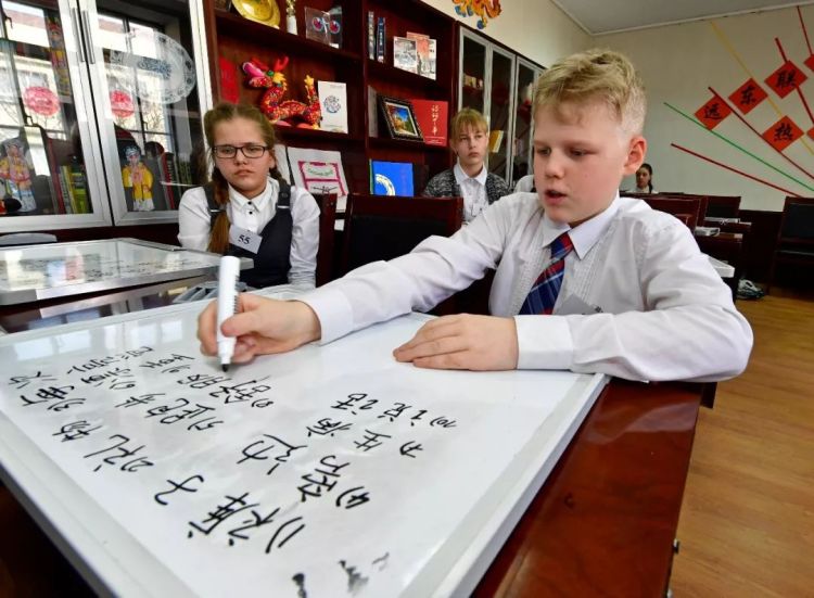 ↑俄羅斯學生在符拉迪沃斯托克遠東聯邦大學孔子學院書寫漢字。(2017年,尤里·斯米秋克)
