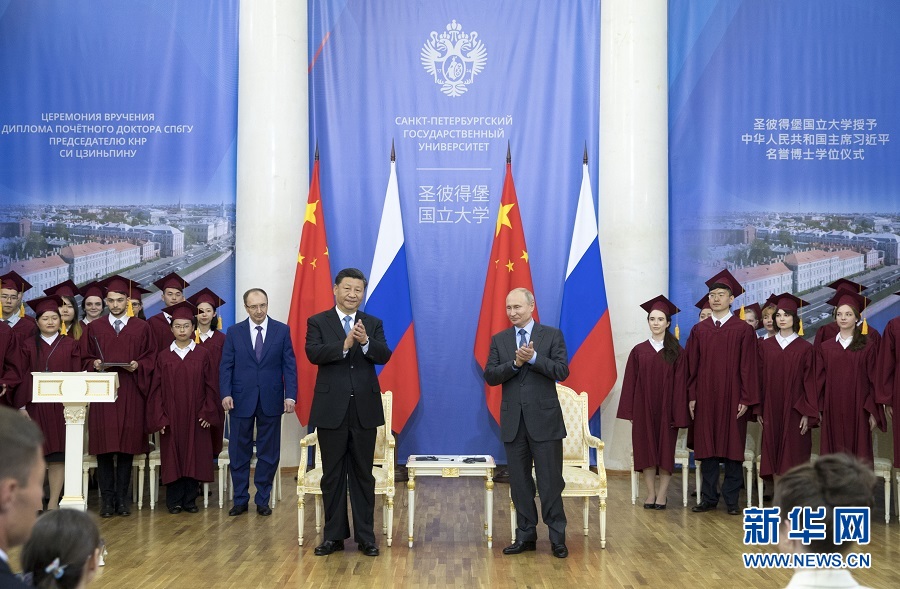 6月6日,國家主席習(xí)近平在圣彼得堡出席接受圣彼得堡國立大學(xué)名譽博士學(xué)位儀式。俄羅斯總統(tǒng)普京出席儀式。新華社記者 李濤 攝