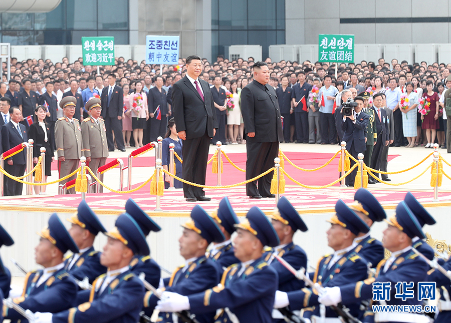 朝方在機(jī)場(chǎng)舉行隆重歡迎儀式。在21響禮炮聲中,軍樂隊(duì)奏中朝兩國(guó)國(guó)歌,習(xí)近平在金正恩陪同下檢閱了朝鮮人民軍三軍儀仗隊(duì),并觀看了分列式表演。