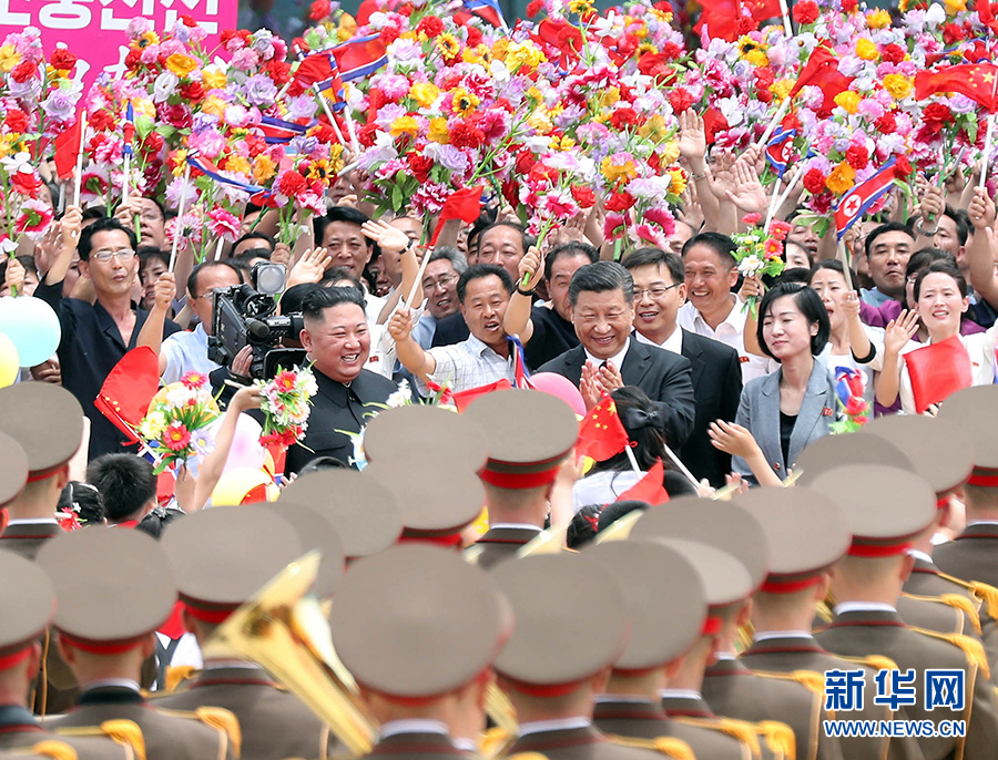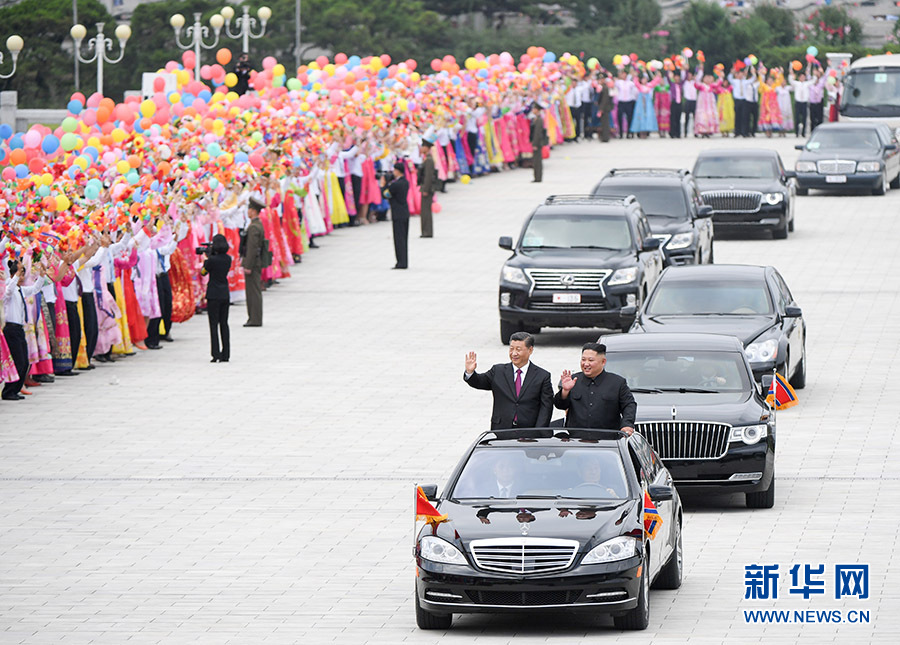 習(xí)近平抵達(dá)黎明大街路口,換乘敞篷車,與金正恩同車前往錦繡山太陽宮廣場(chǎng)。街道兩旁,人山人海,盛況空前。歡迎民眾站在高坡上,從住宅樓的窗臺(tái)上,向中國(guó)貴賓歡呼致敬。到處都是熱情的笑臉,友好的歡呼聲不絕于耳。習(xí)近平和金正恩向歡迎的人群頻頻揮手致意。