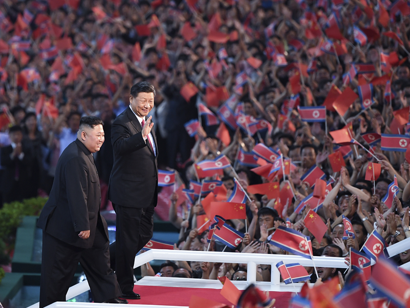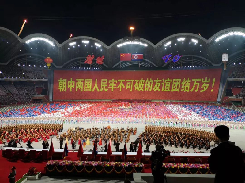 演出在以“朝中友誼萬古長青”為主題的大型歌舞表演中結束。習近平和金正恩同全場觀眾一起站立,為藝術家和演員們的精湛表演送上經(jīng)久不息的掌聲。