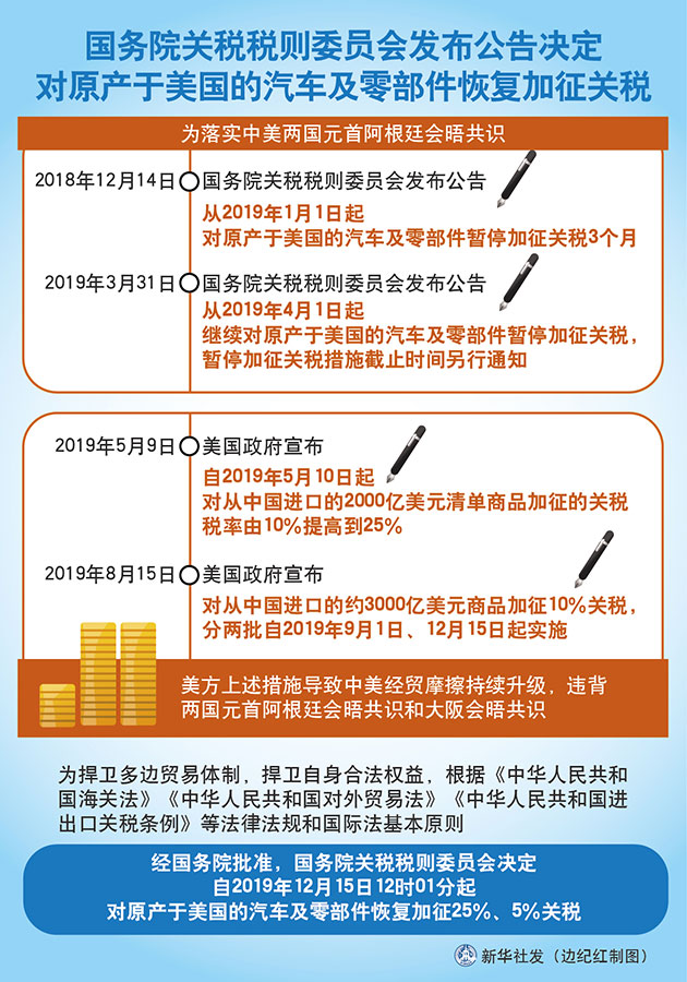 為捍衛(wèi)多邊貿(mào)易體制,捍衛(wèi)自身合法權(quán)益,根據(jù)《中華人民共和國海關(guān)法》《中華人民共和國對外貿(mào)易法》《中華人民共和國進(jìn)出口關(guān)稅條例》等法律法規(guī)和國際法基本原則,經(jīng)國務(wù)院批準(zhǔn),國務(wù)院關(guān)稅稅則委員會決定,自2019年12月15日12時01分起,對原產(chǎn)于美國的汽車及零部件恢復(fù)加征25%、5%關(guān)稅。