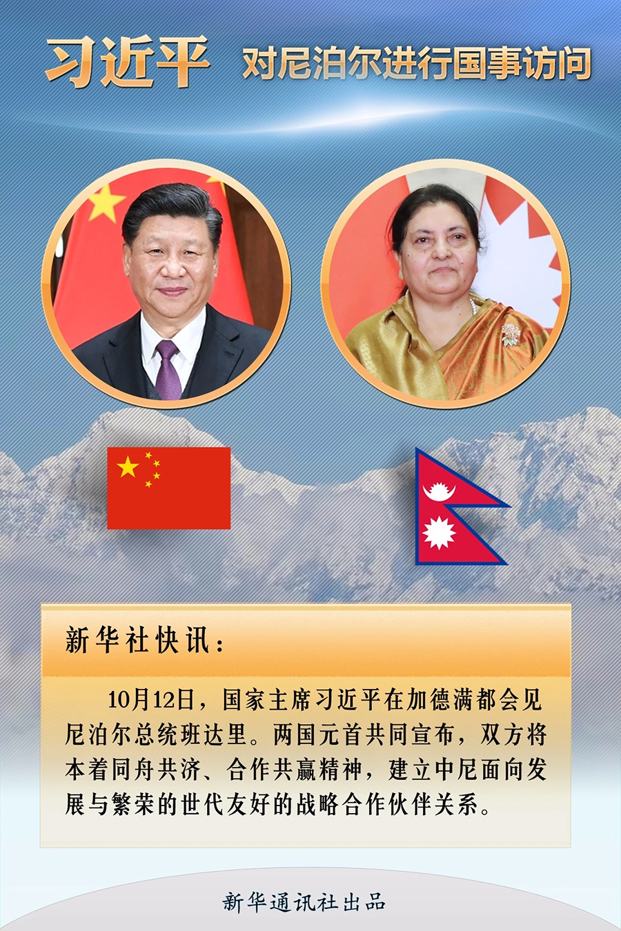 新華社加德滿都10月12日電 10月12日,國(guó)家主席習(xí)近平在加德滿都會(huì)見尼泊爾總統(tǒng)班達(dá)里。兩國(guó)元首共同宣布,雙方將本著同舟共濟(jì)、合作共贏精神,建立中尼面向發(fā)展與繁榮的世代友好的戰(zhàn)略合作伙伴關(guān)系。