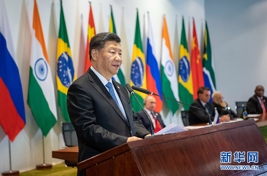當(dāng)?shù)貢r(shí)間11月14日,金磚國(guó)家領(lǐng)導(dǎo)人同金磚國(guó)家工商理事會(huì)和新開(kāi)發(fā)銀行對(duì)話會(huì)在巴西利亞舉行。中國(guó)國(guó)家主席習(xí)近平、巴西總統(tǒng)博索納羅、俄羅斯總統(tǒng)普京、印度總理莫迪、南非總統(tǒng)拉馬福薩共同出席。這是習(xí)近平發(fā)表講話。 新華社記者 李學(xué)仁 攝