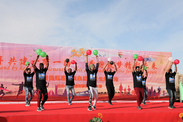 來自中國、科威特、埃及、土耳其、印度、巴基斯坦等16個(gè)國家的員工們組成了20個(gè)方陣,他們身著印有項(xiàng)目地塊顏色和形狀的文化衫,手持16個(gè)國家的國旗,在長達(dá)6公里的項(xiàng)目工地道路上長跑。