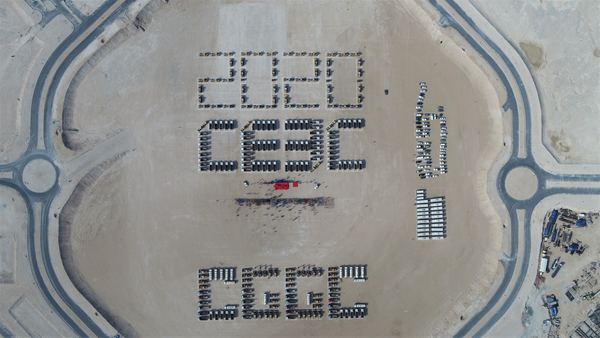 當(dāng)天上午,在主題為“攜手共建‘一帶一路’,奔跑筑夢精彩未來”的長跑活動開幕式現(xiàn)場,由240多輛卡車、挖掘機(jī)、平地機(jī)等車輛設(shè)備擺出的2020、CEEC(中國能建英文縮寫)、CGGC(葛洲壩集團(tuán)英文縮寫)字樣排布在沙漠上,氣勢壯觀。