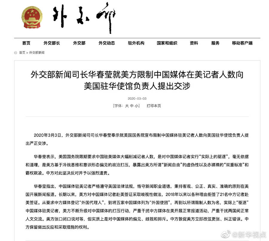 外交部新聞司司長(zhǎng)華春瑩3日奉示就美國(guó)國(guó)務(wù)院宣布限制中國(guó)媒體駐美記者人數(shù)向美國(guó)駐華使館負(fù)責(zé)人提出嚴(yán)正交涉。華春瑩表示,美國(guó)國(guó)務(wù)院限期要求中國(guó)駐美媒體大幅削減記者人數(shù),是對(duì)中國(guó)媒體記者實(shí)行“實(shí)際上的驅(qū)逐”,毫無(wú)依據(jù)和道理,是美方基于冷戰(zhàn)思維和意識(shí)形態(tài)偏見的政治打壓,暴露出美方所謂“新聞自由”的虛偽性以及赤裸裸的“雙重標(biāo)準(zhǔn)”和霸權(quán)欺凌。中方對(duì)此堅(jiān)決反對(duì)并予以強(qiáng)烈遣責(zé)。中方敦促美方立即改弦更張、糾正錯(cuò)誤。中方保留做出反應(yīng)和采取措施的權(quán)利。(記者朱超)