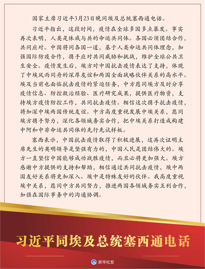 習(xí)近平指出,這段時間,疫情在全球多國多點(diǎn)暴發(fā)。事實(shí)再次表明,人類是休戚與共的命運(yùn)共同體。各國必須團(tuán)結(jié)合作,共同應(yīng)對。中國將同各國一道,基于人類命運(yùn)共同體理念,加強(qiáng)國際防疫合作,攜手應(yīng)對共同威脅和挑戰(zhàn),維護(hù)全球公共衛(wèi)生安全。疫情發(fā)生后,埃方對中國抗擊疫情表達(dá)了支持,體現(xiàn)了中埃風(fēng)雨同舟的深厚友誼和兩國全面戰(zhàn)略伙伴關(guān)系的高水平。埃及當(dāng)前也面臨抗擊疫情的緊迫任務(wù),中方愿同埃方及時分享疫情信息、防控救治經(jīng)驗(yàn)、醫(yī)療研究成果,提供醫(yī)療物資,支持埃方疫情防控工作,共同抗擊疫情。相信這次攜手抗擊疫情,將加深中埃兩國傳統(tǒng)友誼。中方高度重視發(fā)展中埃關(guān)系,愿同埃方攜手努力,深化各領(lǐng)域務(wù)實(shí)合作,把中埃關(guān)系打造成構(gòu)建中阿和中非命運(yùn)共同體的先行先試樣板。
