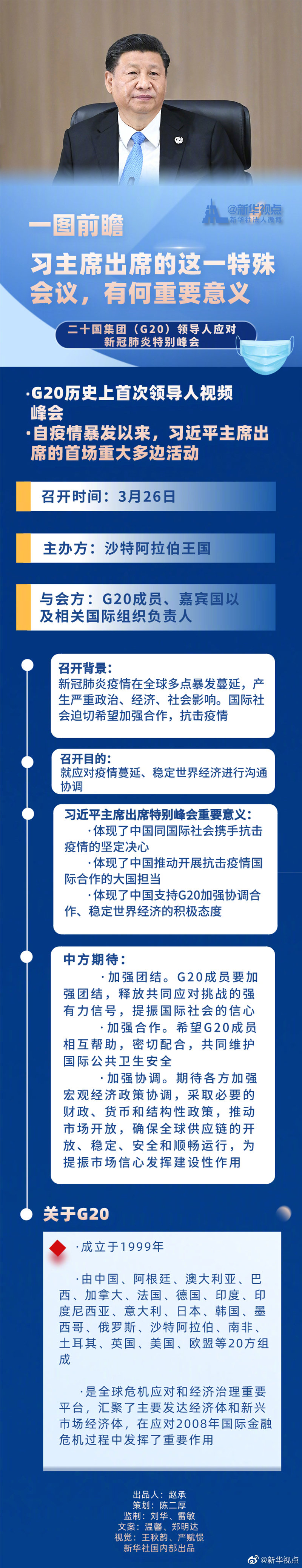國家主席習近平將于3月26日出席二十國集團領導人應對新冠肺炎特別峰會,此次峰會將以視頻的方式舉行。習近平主席出席此次特別峰會有什么重要意義?