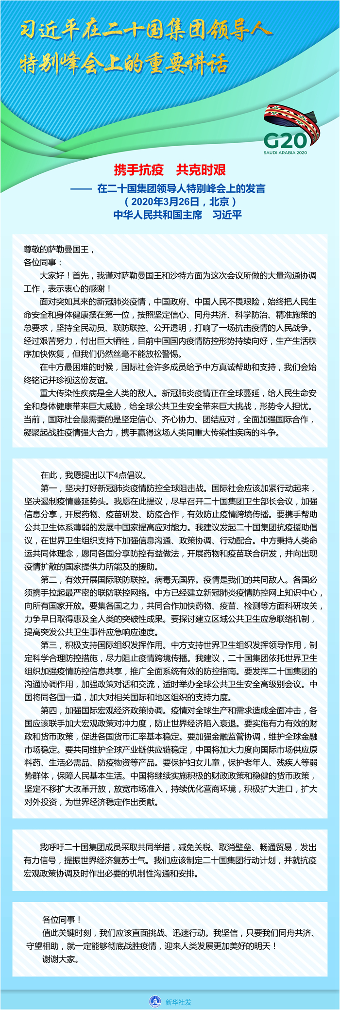 習(xí)近平在二十國集團領(lǐng)導(dǎo)人特別峰會上的重要講話(全文)