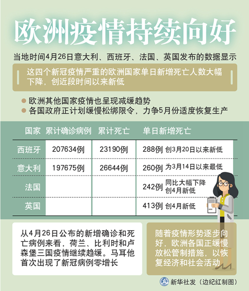 新華社里斯本4月26日電 綜合新華社駐歐洲地區(qū)記者報(bào)道:意大利、西班牙、法國(guó)、英國(guó)26日發(fā)布的數(shù)據(jù)顯示,這四個(gè)新冠疫情嚴(yán)重的歐洲國(guó)家單日新增死亡人數(shù)大幅下降,創(chuàng)近段時(shí)間以來(lái)新低。歐洲其他國(guó)家疫情也呈現(xiàn)減緩趨勢(shì)。各國(guó)政府正計(jì)劃緩慢松綁限令,力爭(zhēng)5月份適度恢復(fù)生產(chǎn)。