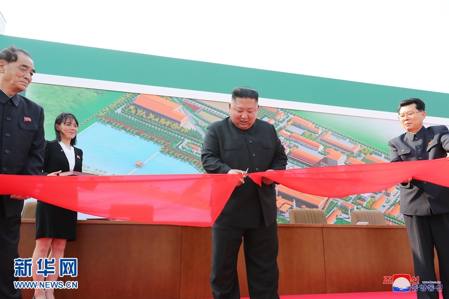 報道說,在歡迎曲中,金正恩來到竣工儀式現場,為肥料生產基地剪彩。