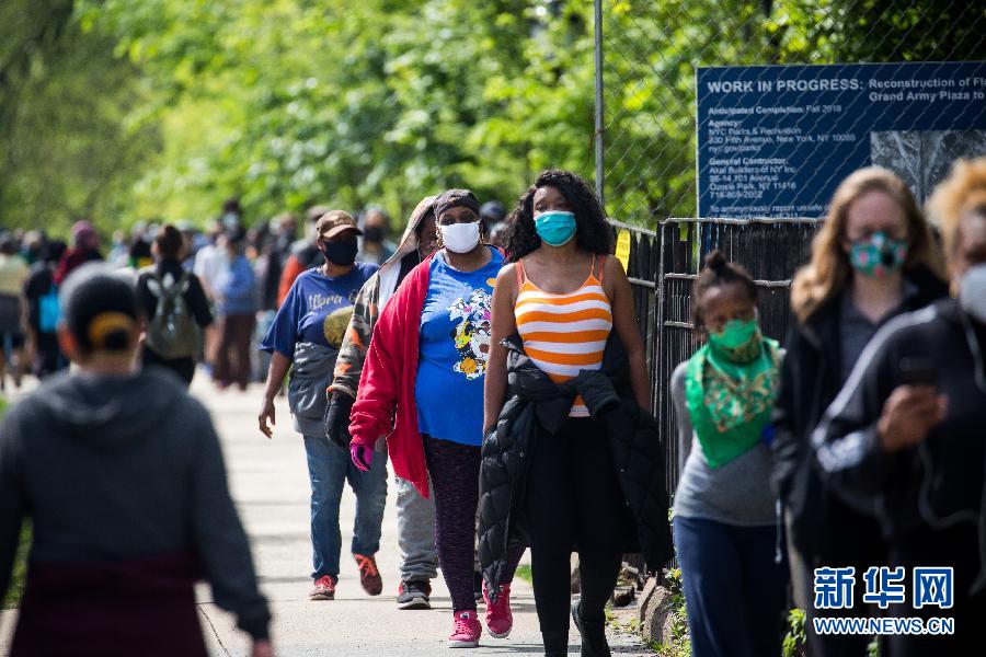 5月3日,在美國紐約,人們?cè)谝粋€(gè)發(fā)放點(diǎn)排隊(duì)領(lǐng)取口罩。 新華社發(fā)(郭克攝)