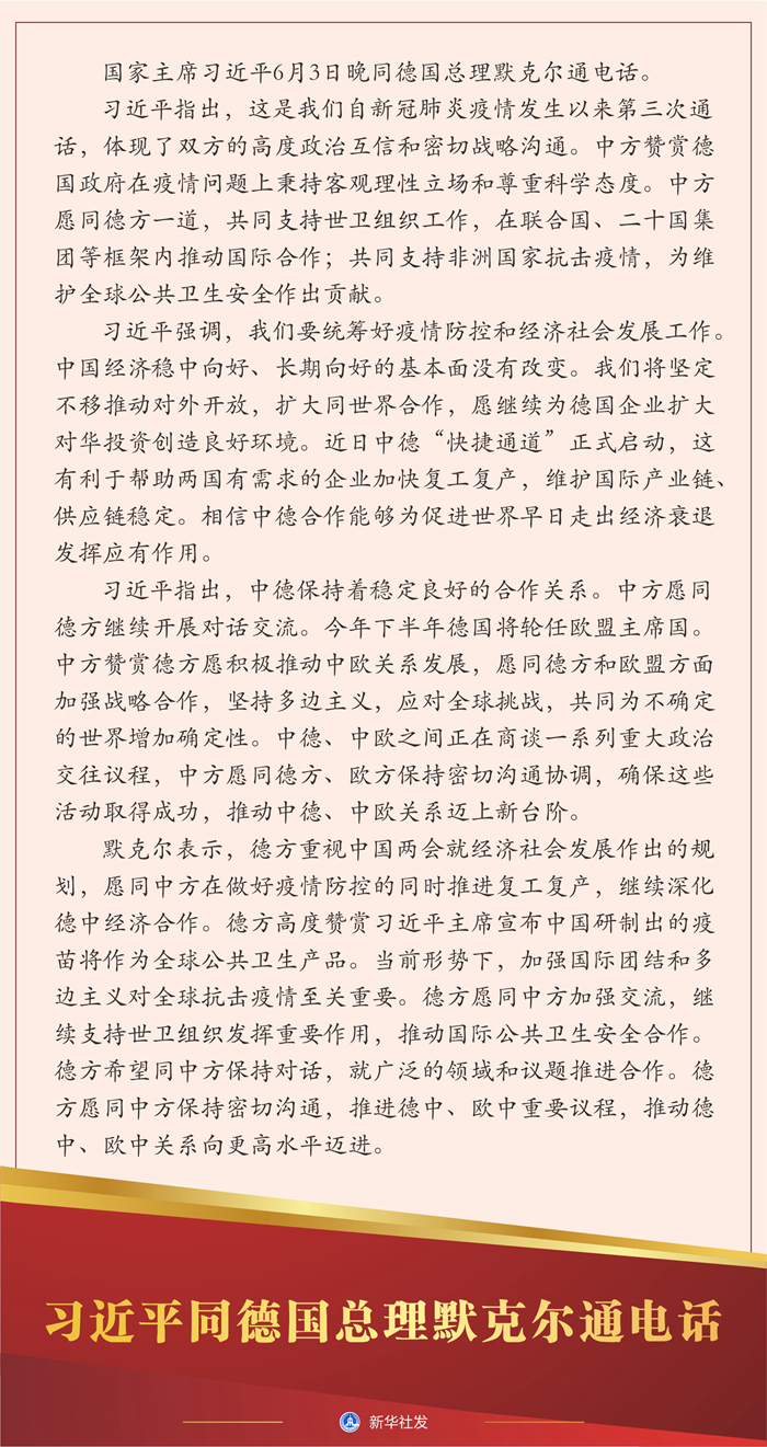 習近平指出,這是我們自新冠肺炎疫情發生以來第三次通話,體現了雙方的高度政治互信和密切戰略溝通。中方贊賞德國政府在疫情問題上秉持客觀理性立場和尊重科學態度。中方愿同德方一道,共同支持世衛組織工作,在聯合國、二十國集團等框架內推動國際合作;共同支持非洲國家抗擊疫情,為維護全球公共衛生安全作出貢獻。