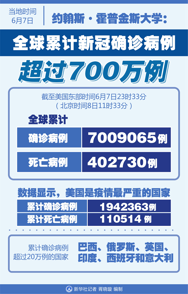 新華社紐約6月7日電 美國(guó)約翰斯·霍普金斯大學(xué)7日發(fā)布的新冠疫情統(tǒng)計(jì)數(shù)據(jù)顯示,截至美國(guó)東部時(shí)間7日23時(shí)33分(北京時(shí)間8日11時(shí)33分),全球累計(jì)確診病例達(dá)到7009065例,死亡病例為402730例。