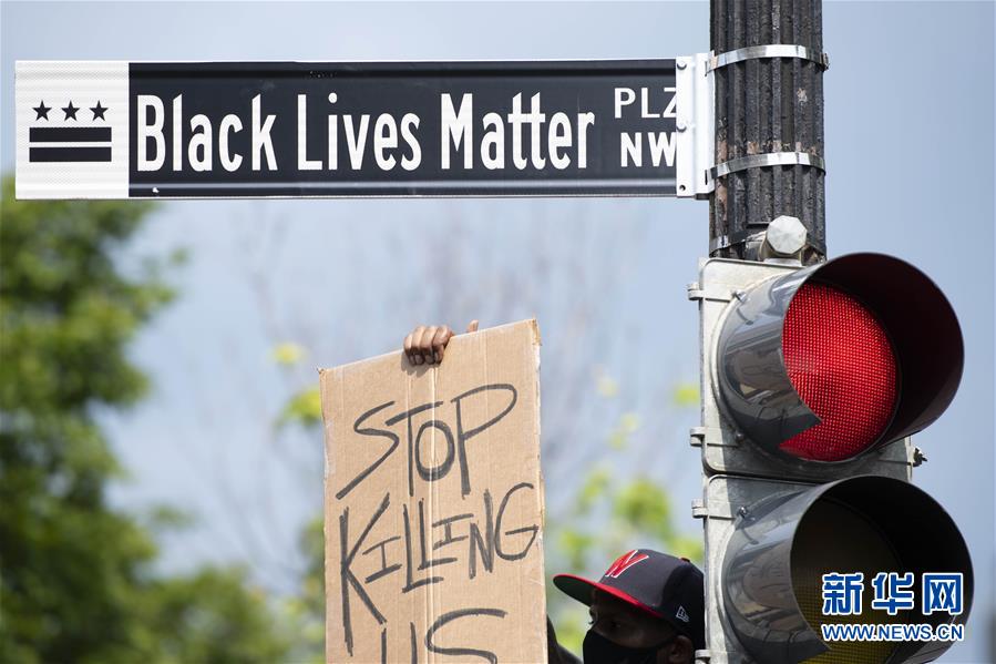 6月6日,一名男子手舉“停止殺害我們”的標語在美國華盛頓白宮附近的“黑人的命也是命廣場”路牌下參加游行活動。 新華社記者 劉杰 攝