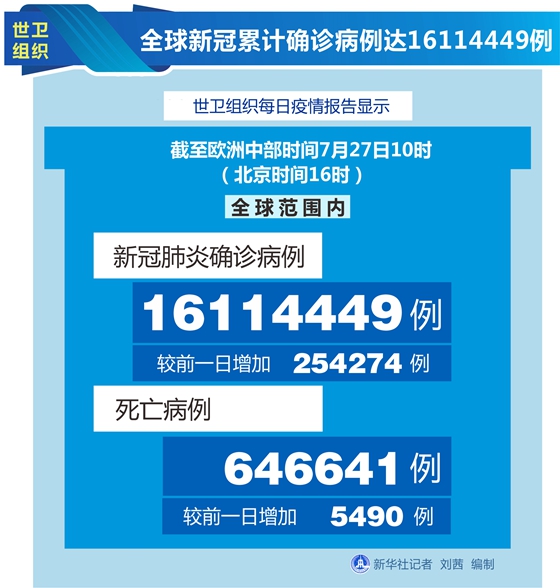 世衛(wèi)組織每日疫情報告顯示,截至歐洲中部時間27日10時(北京時間16時),全球確診病例較前一日增加254274例,達到16114449例;死亡病例增加5490例,達到646641例。