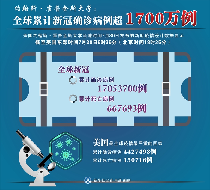 新華社紐約7月30日電 美國(guó)約翰斯·霍普金斯大學(xué)30日發(fā)布的新冠疫情統(tǒng)計(jì)數(shù)據(jù)顯示,截至美國(guó)東部時(shí)間30日6時(shí)35分(北京時(shí)間18時(shí)35分),全球累計(jì)確診病例達(dá)到17053700例,累計(jì)死亡667693例。