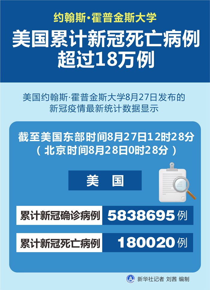 新華社紐約8月27日電? 美國約翰斯·霍普金斯大學(xué)27日發(fā)布的新冠疫情最新統(tǒng)計(jì)數(shù)據(jù)顯示,截至美國東部時(shí)間27日12時(shí)28分(北京時(shí)間28日0時(shí)28分),美國累計(jì)新冠死亡病例180020例,累計(jì)確診病例5838695例。