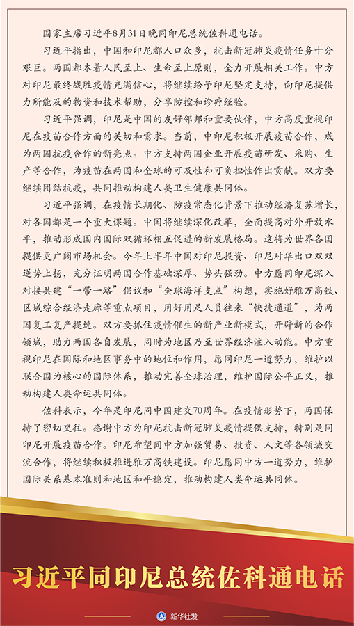 習近平強調,印尼是中國的友好鄰邦和重要伙伴,中方高度重視印尼在疫苗合作方面的關切和需求。當前,中印尼積極開展疫苗合作,成為兩國抗疫合作的新亮點。中方支持兩國企業開展疫苗研發、采購、生產等合作,為疫苗在兩國和全球的可及性和可負擔性作出貢獻。雙方要繼續團結抗疫,共同推動構建人類衛生健康共同體。