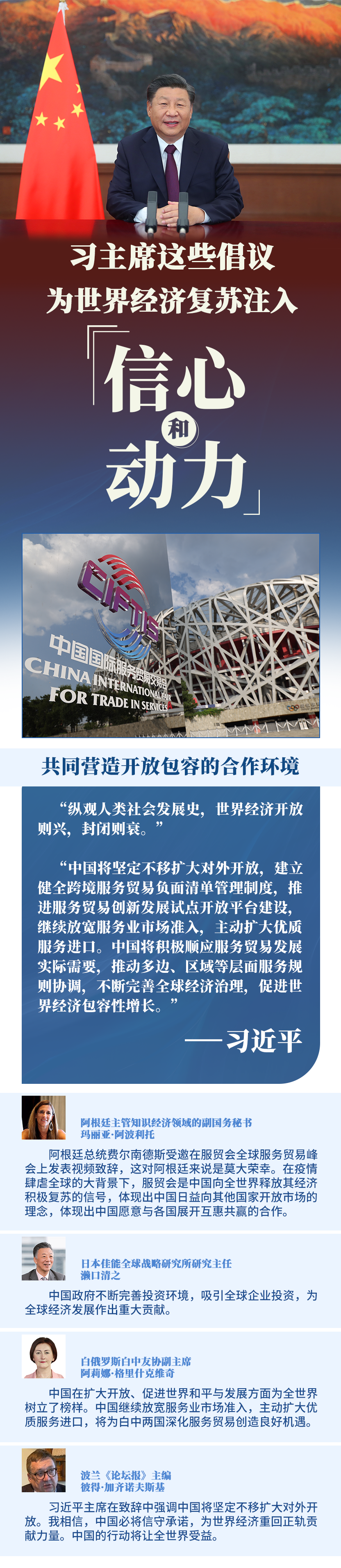 在全球范圍新冠疫情尚未得到全面控制、經濟全球化遭遇逆流的背景下,習主席就促進全球服務業開放合作提出3點倡議,為推動世界經濟盡快復蘇注入信心和動力,向國際社會展現中國負責任大國的作為和擔當。