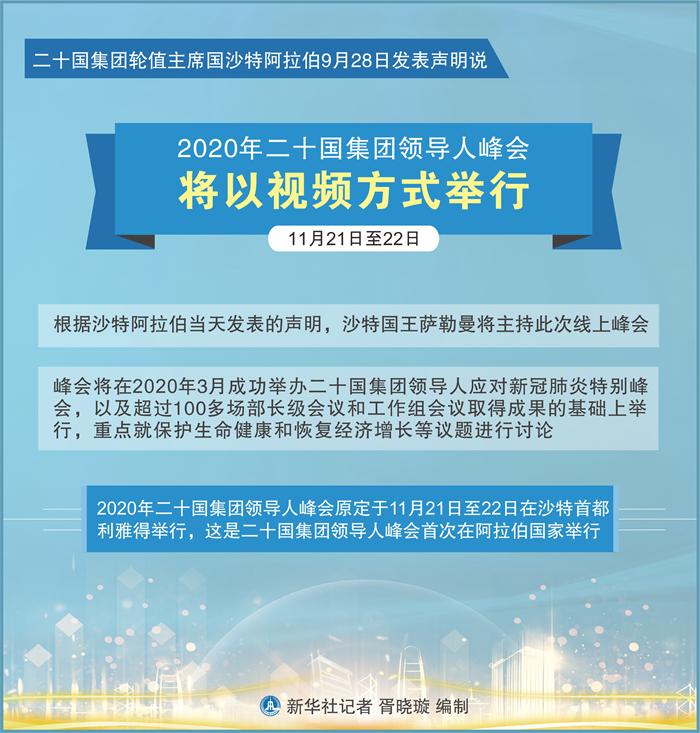 根據(jù)沙特阿拉伯當(dāng)天發(fā)表的聲明,沙特國王薩勒曼將主持此次線上峰會(huì)。峰會(huì)將在今年3月成功舉辦二十國集團(tuán)領(lǐng)導(dǎo)人應(yīng)對(duì)新冠肺炎特別峰會(huì),以及超過100多場(chǎng)部長(zhǎng)級(jí)會(huì)議和工作組會(huì)議取得成果的基礎(chǔ)上舉行,重點(diǎn)就保護(hù)生命健康和恢復(fù)經(jīng)濟(jì)增長(zhǎng)等議題進(jìn)行討論。