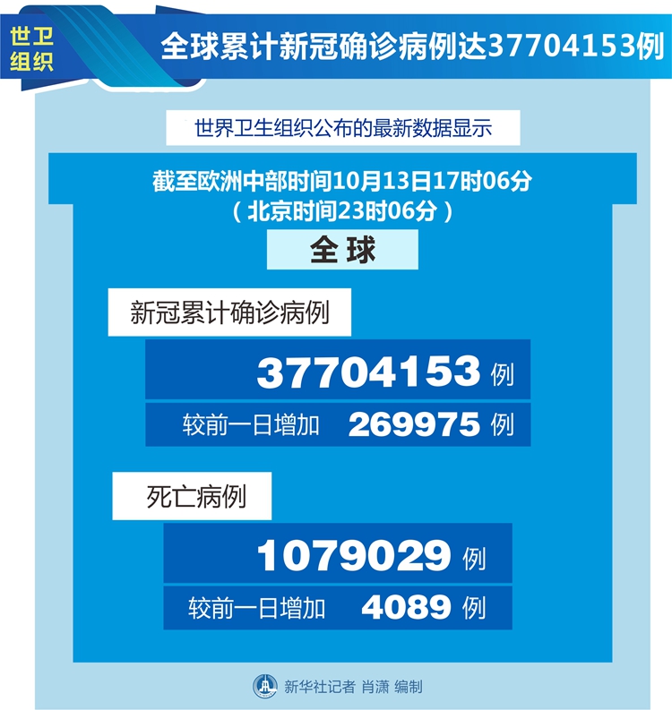 新華社日內瓦10月13日電(記者劉曲)世界衛生組織13日公布的最新數據顯示,全球累計新冠確診病例達37704153例。
