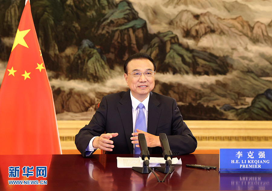 11月13日下午,國務院總理李克強在東盟商務與投資峰會上發表視頻致辭。 新華社記者 龐興雷 攝
