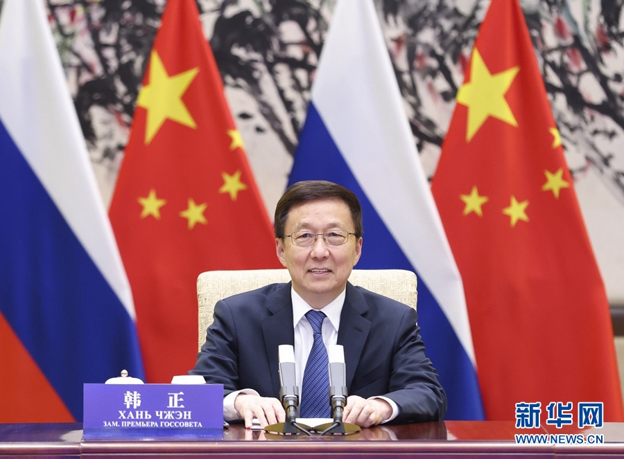 11月17日,中共中央政治局常委、國務院副總理、中俄投資合作委員會中方主席韓正與俄羅斯第一副總理、委員會俄方主席別洛烏索夫通過視頻方式共同主持中俄投資合作委員會第七次會議。新華社記者 龐興雷 攝
