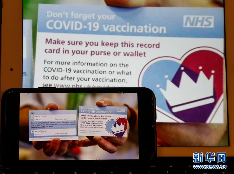 這是12月8日在英國倫敦拍攝的顯示新冠疫苗接種卡的電腦屏幕和手機屏幕。
