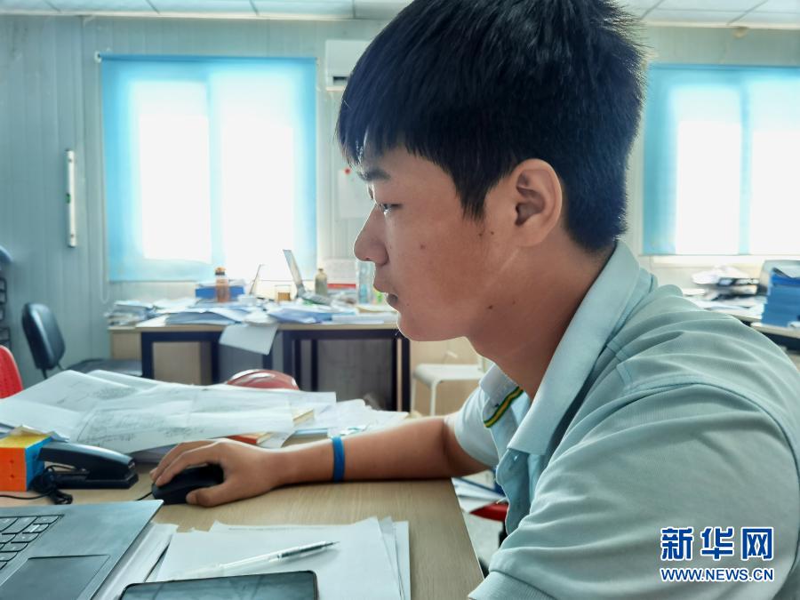 12月14日,在馬爾代夫馬累,臉上有口罩印的安全工程師劉平建在維拉納國際機場水飛航站樓項目辦公室工作。新華社發(fā)(北京城建集團供圖)